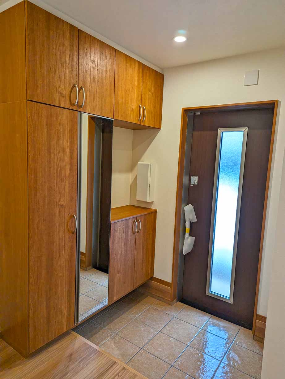 ワイドな玄関収納は、家族みんなの靴をすっきりと整理。来客者が来たときでも安心です。
